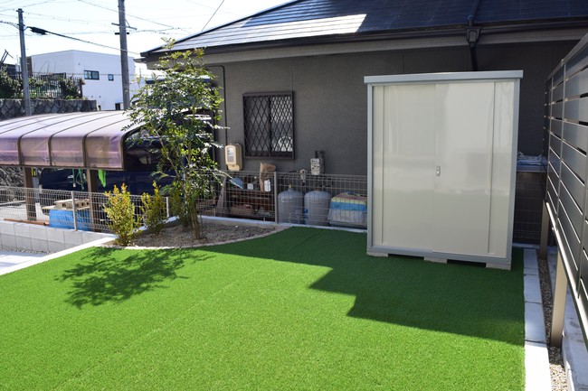 今回はお庭の人工芝敷き、花壇の造作と物置設置工事をご依頼いただきました。