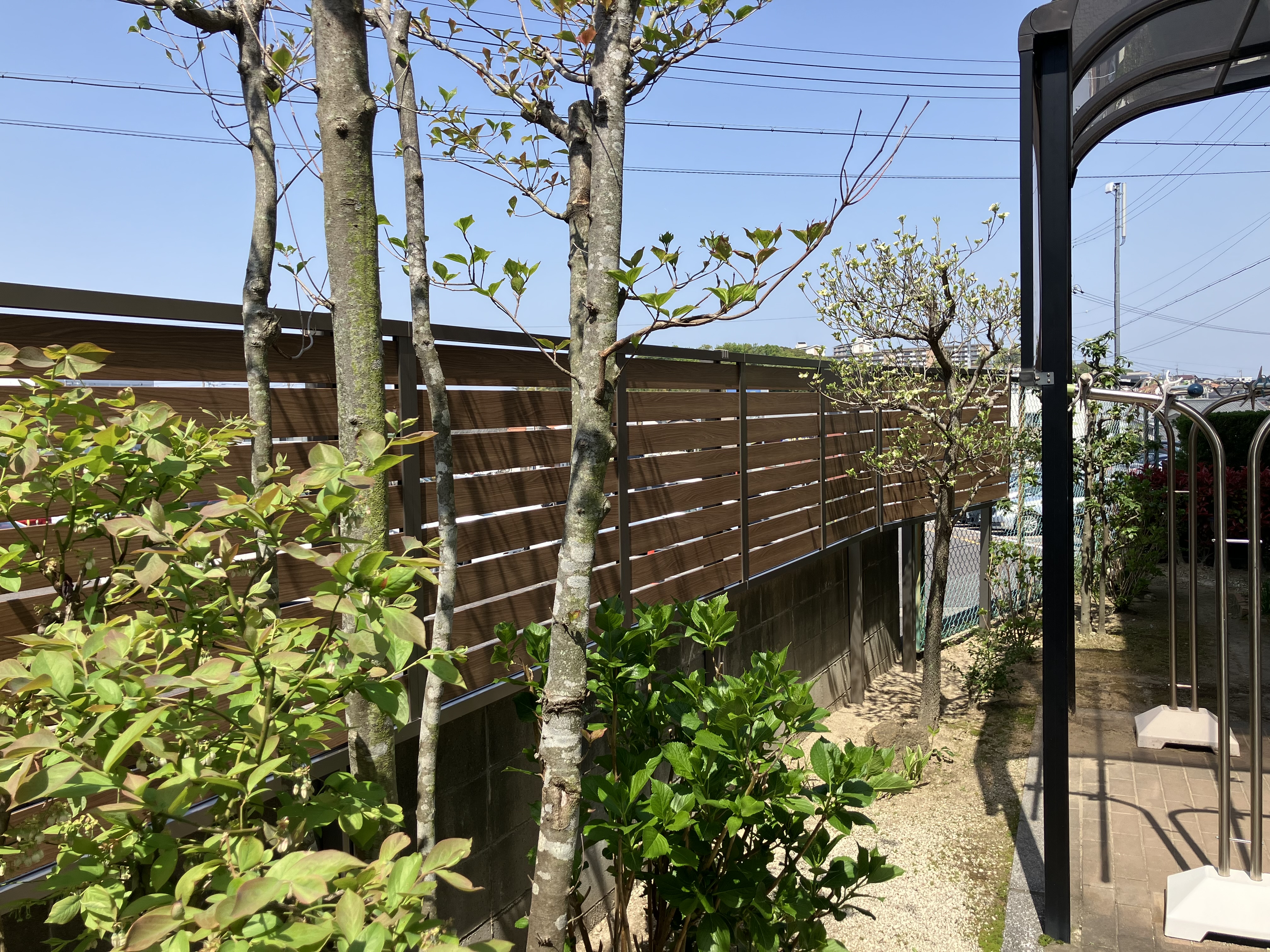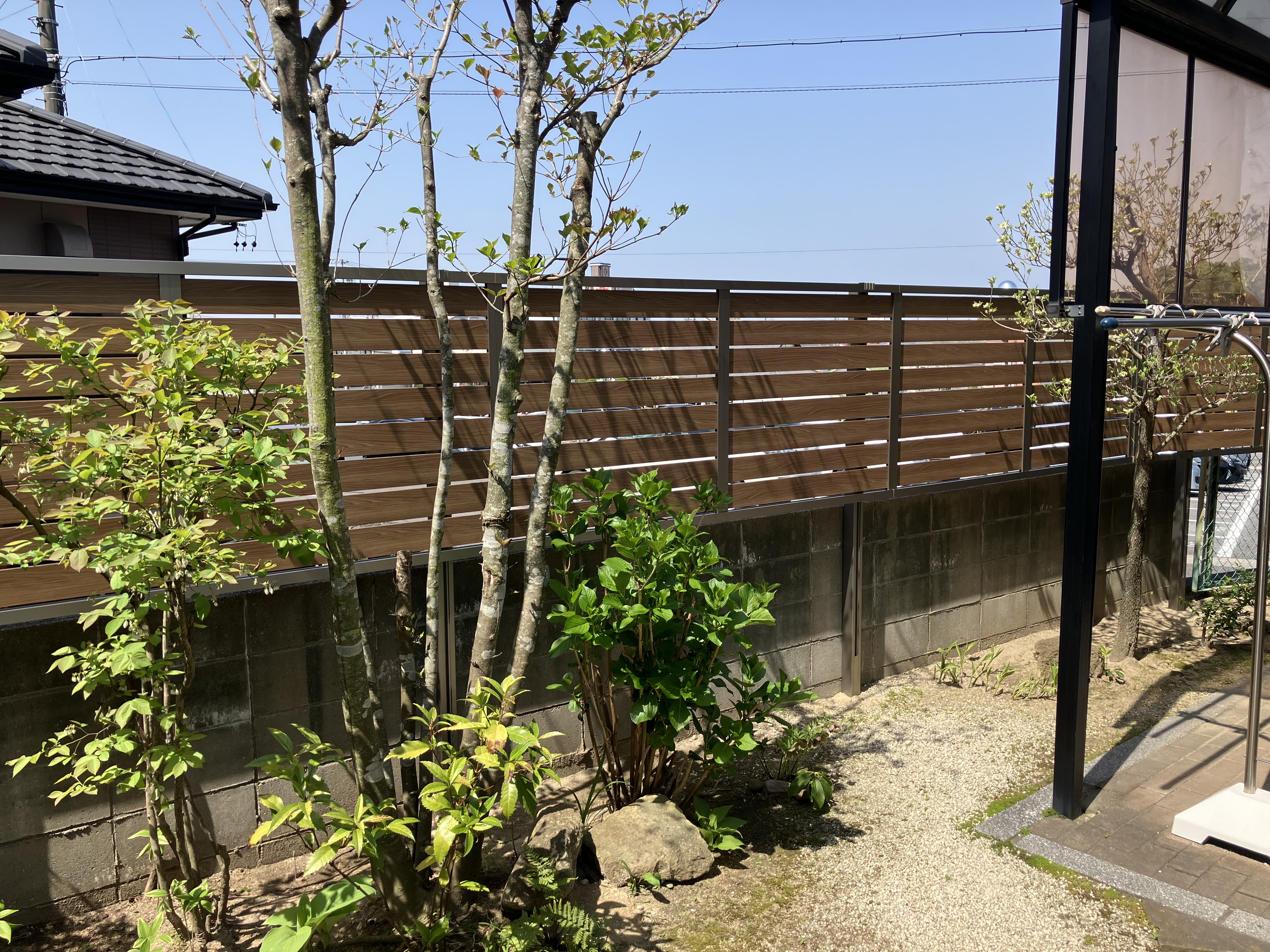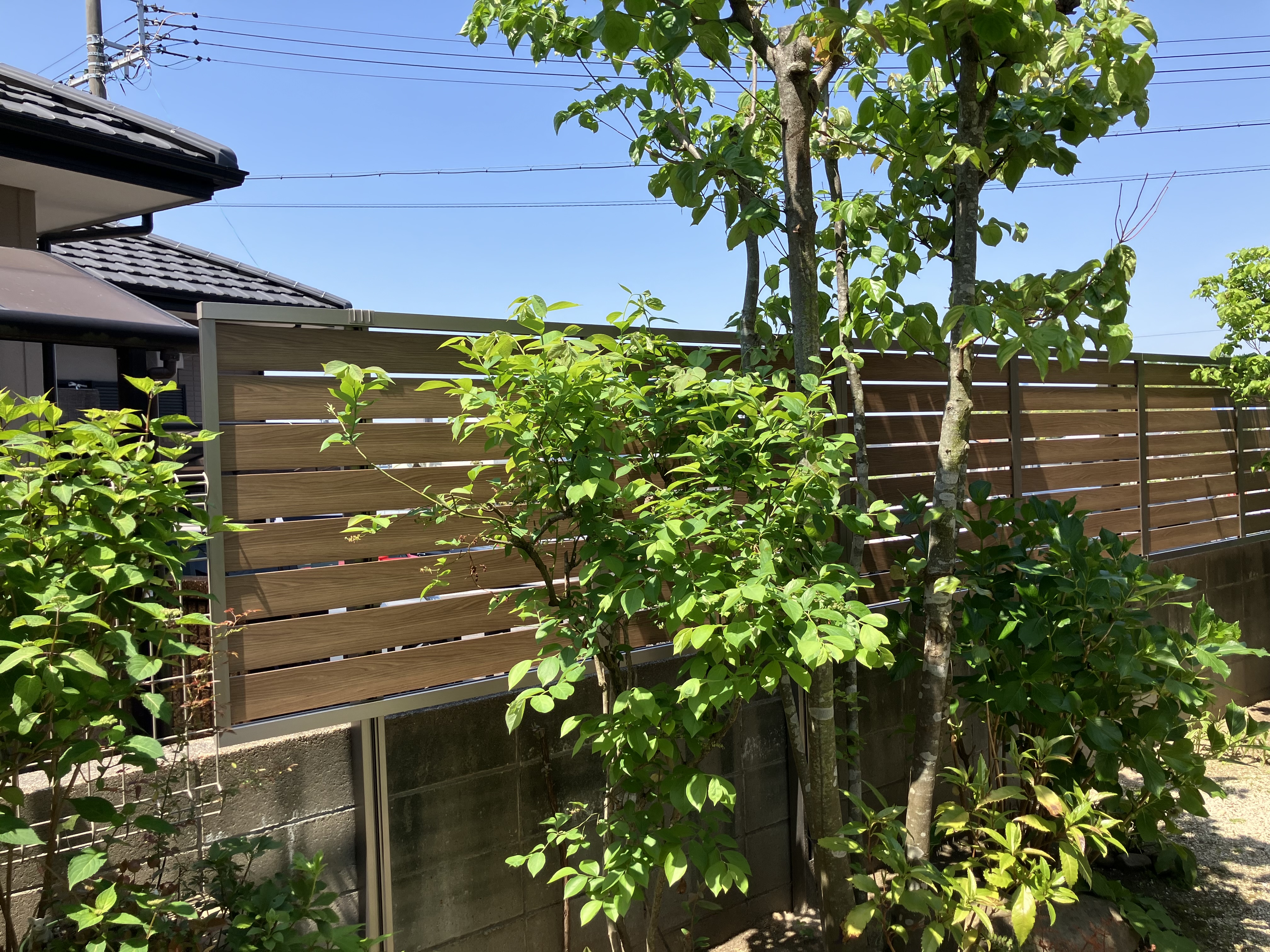 木製のフェンスやパーゴラを撤去し、木調の目隠しフェンスを設置しました。