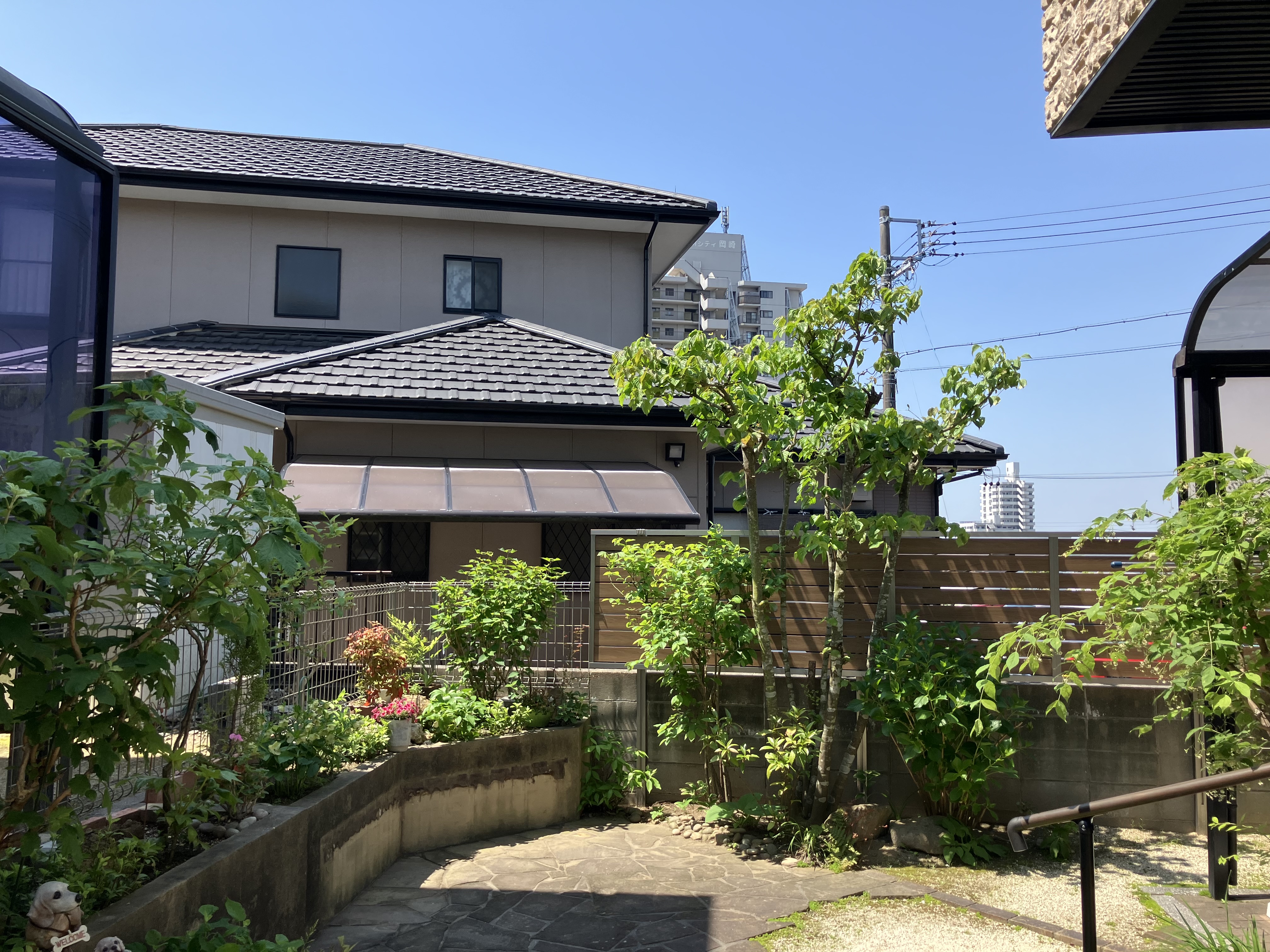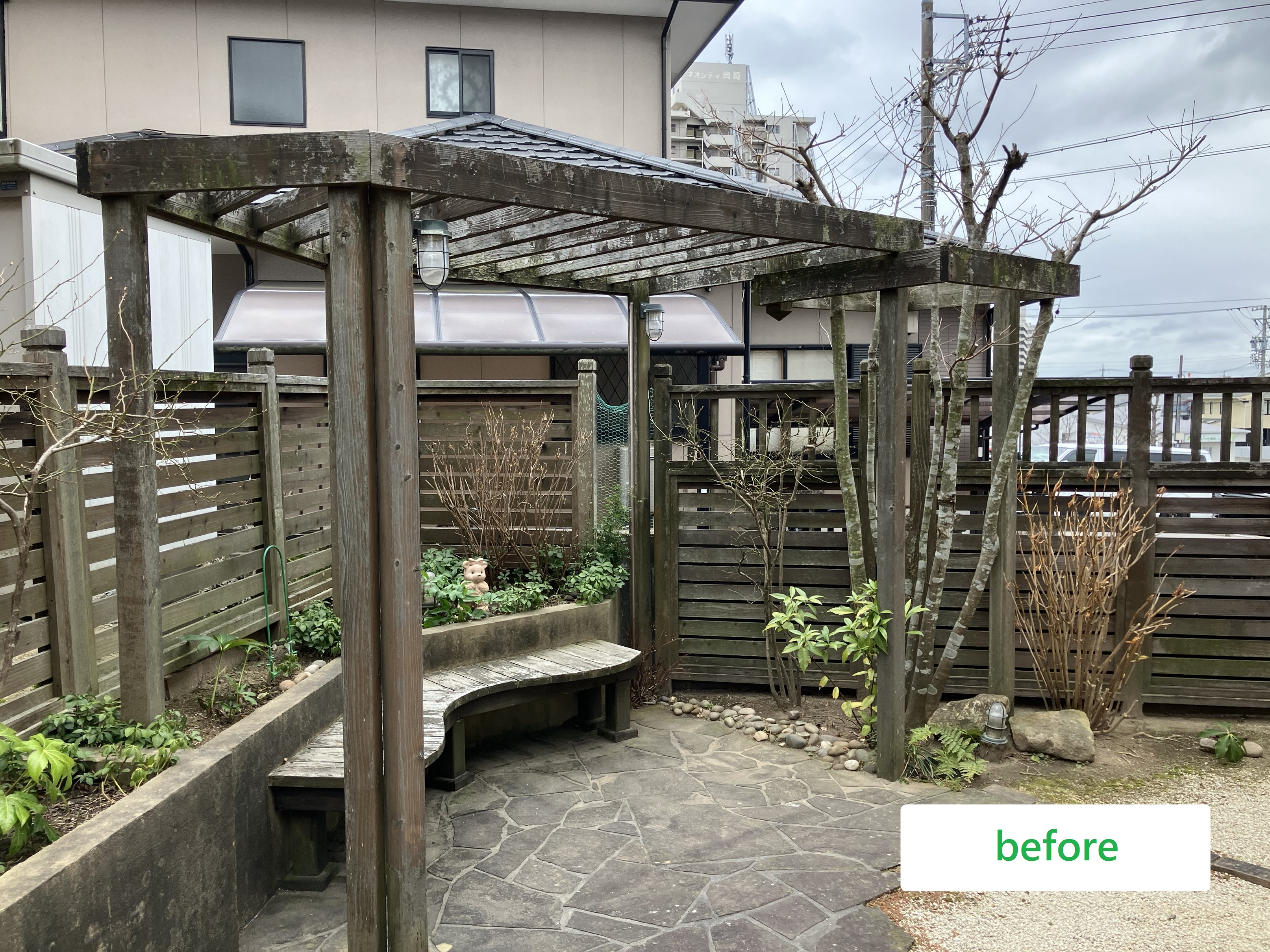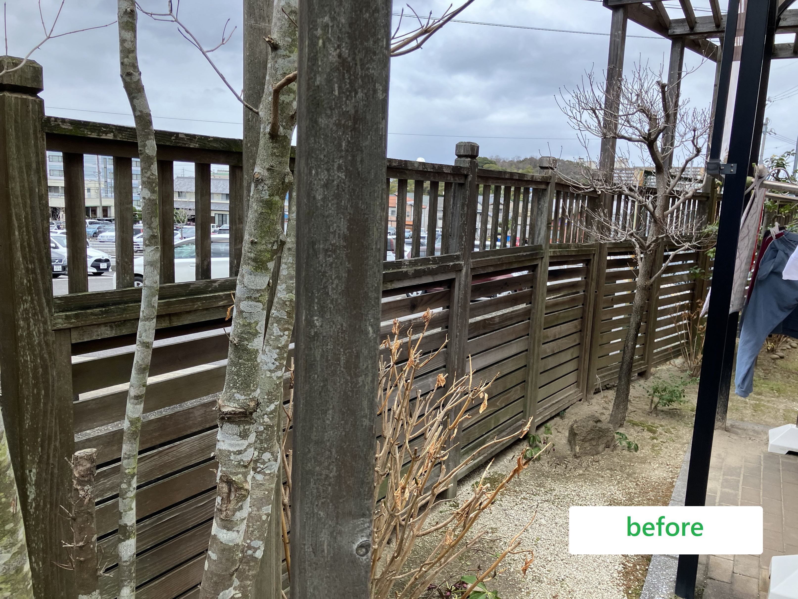 木製のフェンスやパーゴラを撤去し、木調の目隠しフェンスを設置しました。