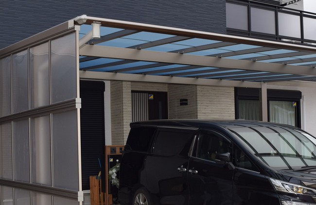 三協アルミ二台用カーポートを玄関前に入れ込む形で設置させていただきました、お隣さん側に自転車を止められるという事で、オプションで雨風を軽減できるサイドパネルを設置しました。