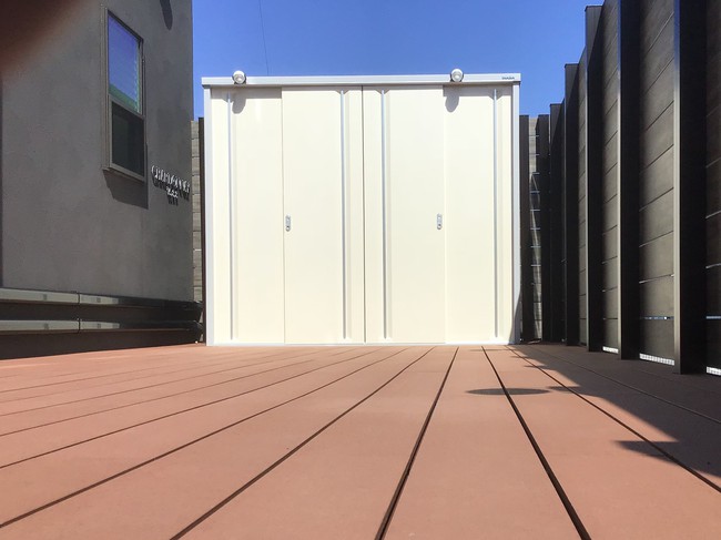 突き当りに設置した物置はデッキの床面と開口下の高さを合わせて段差をなくし使いやすくしました。