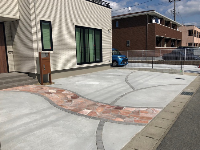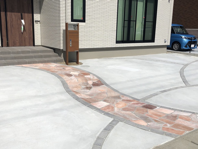 乱形の天然石を張ったアプローチと駐車場の目地をRで描いた柔らかなイメージの外構。