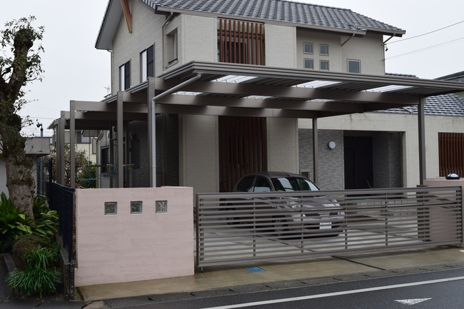駐車場から勝手口までをカバーする変形のカーポート。これで雨の日のお出かけも安心ですね。