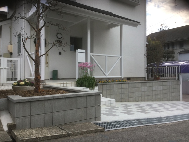 同じ白いタイルで階段を作り、拡張した駐車場部分はTOYO『キセキ』の2色使いで