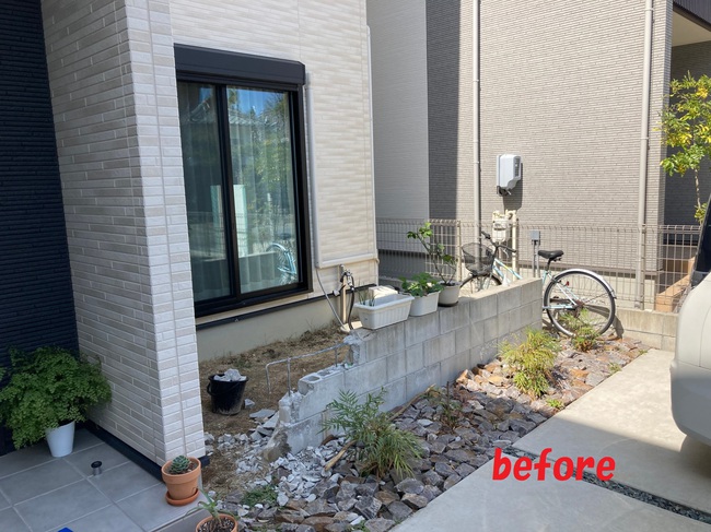 危険な状態なのでブロック塀の解体とお子様が安心して遊べるお庭にしたいというご相談でした。