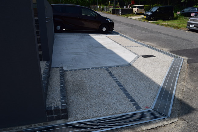 建物の外観に合わせた、黒を基調としたモダン外構。