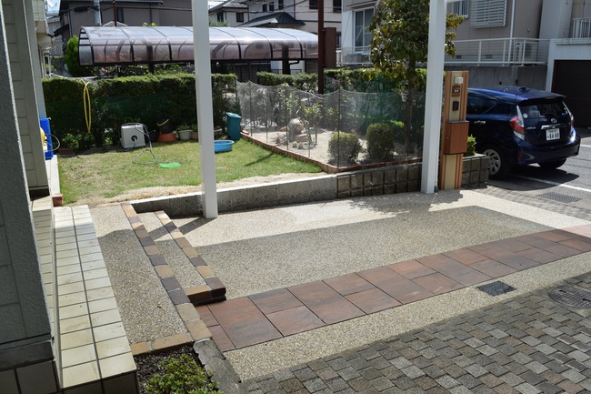 門まわり、花壇を撤回し拡張部分はアプローチとして平板でアクセントを作りました。