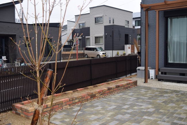 天然芝を撤去し、レンガで舗装、サイドスペースに花壇を設置させていただきました。